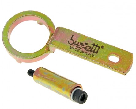 Spezialwerkzeug von BUZZETTI, um die Variomatik zu Montage- und Demontagearbeiten zu blockieren. Die kinderleichte Handhabung ermöglicht ein schnelles und fachgerechtes Arbeiten. Dieses Werkzeug eignet sich besser für Arbeiten im Antriebsbereich als der Kolbenstopper, da die Gefahr von Kolbenschäden ist hierbei ausgeschlossen ist. Das Werkzeug kompatibel mit Piaggio 250 - 300ccm 4-Takt Motoren