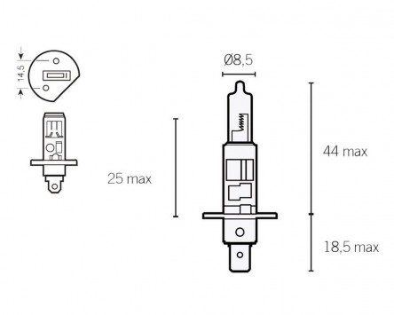 H1 Halogenglühlampe für Frontscheinwerfer von Zweirädern oder Quad / ATV mit P14,5s Sockel. Die Glühbirne wird mit 12V betrieben und verfügt über eine Leistung von 55W.