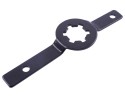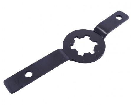 Das Werkzeug wird einfach über die Verzahnung des Kickstartermitnehmers gelegt und durch die beiden Bohrungen mit langen Schraube oder Bolzen am Motorgehäuse fixiert. Die Mutter der Variomatik kann dann problemlos gelöst oder befestigt werden. Leider sind die benötigten längeren Schrauben oder Bolzen nicht im Lieferumfang enthalten und müssen selbst besorgt werden. Dieses Werkzeug eignet sich besser für Arbeiten im Antriebsbereich als der Kolbenstopper. Die Gefahr von Kolbenschäden ist hierbei ausgeschlossen.