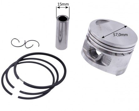 Das Kit wird mit einer Bohrung von 57mm und inklusive aller montagerelevanten Bauteilen wie Dichtsatz, Kolbenringe, Kolbenclips etc. geliefert. Lediglich der Zylinderkopf befindet sich nicht im Lieferumfang, da der originale Kopf weiter verwendet werden kann.