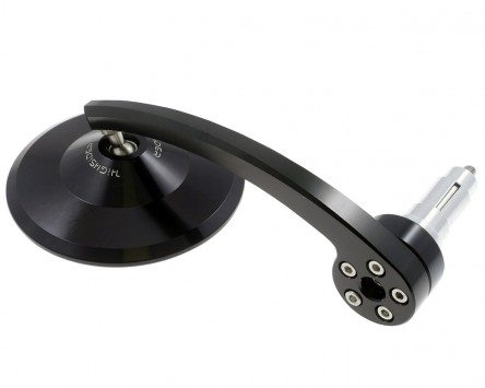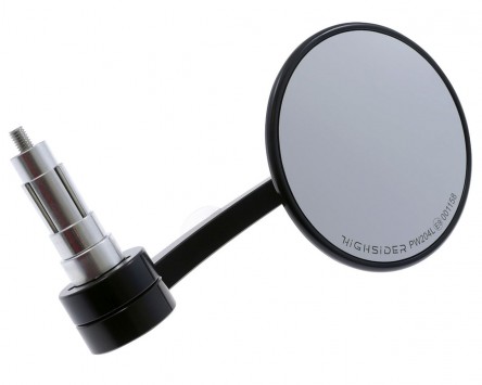 Edler Lenkerendenspiegel von HIGHSIDER aus schwarz eloxiertem Aluminium mit gebogenem Stiel. Die EVO Versionen haben eine neue Stielform und werden mit einem Anbauset geliefert. Der Spiegel passt für Lenker mit einem Lenkerinnendurchmesser von 12 bis 22mm, d.h. für die meisten 7/8 Zoll und 1 Zoll Alu-, oder Stahllenker. Der Spiegel kann rechts und links verwendet werden. Durch die vorhandene E-Nummer kann der Spiegel legal im öffentlichen Straßenverkehr verwendet werden.