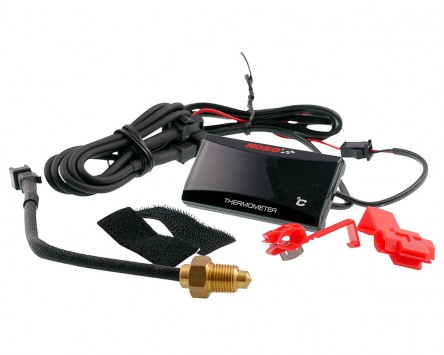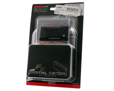 Digitales Thermometer SUPER SLIM vom Premiumhersteller KOSO mit schwarzem Gehäuse und blauer Digitalanzeige. Diese Anzeige ist universell einsetzbar bei jeglicher Art von Fahrzeug. Die Lieferung erfolgt inklusive Klettverschlusshalterung, Verkabelung und Kabeldiebe, Anleitung mit Anschlussplan, ca. 120cm Sensorkabel, 65cm Stromversorgungskabel und einem Temperatursensor mit einem PT1/8 x 28 Gewinde.