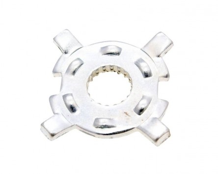 Kickstartermitnehmer (Sternscheibe) bzw. Lüfterradhalter ist das Gegenstück zum Kickstarterritzel. Das sitzt auf der Kurbelwelle vor der Variomatik und die Zähne nutzen sich im Laufe der Zeit ab, was zu Problemen mit dem Kickstarter führt. Dann sollte schnellstens getauscht werden. OEM-Nr. zu Vergleichszwecken: 433862