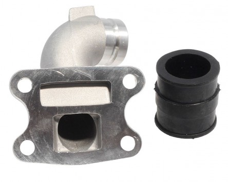 Hochwertiger Ansaugstutzen aus Aluminium mit Gummi Adapter, passend für Fahrzeuge mit 50ccm 2-Takt kompatibel mit Peugeot stehend Motor. Mit diesem Ansaugstutzen kann man Vergaser mit Steckverbindung, anstatt mit verschraubten Flansch fahren, dadurch ist die Auswahl an Tuning Vergaser deutlich größer. Der Ansaugstutzen besitzt zudem auch noch einen Unterdruckanschluss.