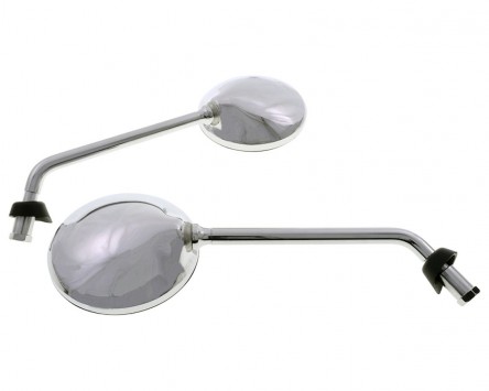 Verchromtes Spiegel Set vom Premiumhersteller FAR zur Montage rechts und links am Lenker, passend für Vespa LX, LXV und Piaggio Liberty 50-200ccm Modelle. Die Spiegel können natürlich auch universell an jedem anderen Fahrzeug mit M8 Gewinde an der Spiegelaufnahme montiert werden. Das Spiegelset entspricht in der Bauform und den Maßen den Originalteilen. Die Montage gestaltet sich sehr einfach und ist in wenigen Minuten erledigt.