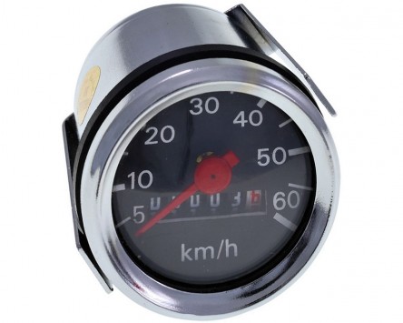 Universal Tachometer 60km/h, 48mm mit schwarzem Ziffernblatt - Die perfekte Ergänzung für eine Vielzahl von Mofas und Mopeds. Dieser Tachometer kombiniert Funktionalität mit einem stilvollen Design und bietet präzise Geschwindigkeitsmessungen.
