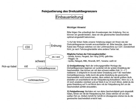 Mit diesem Drehzahlbegrenzer lassen sich getunte Motoren ab einer voreinstellbaren Drehzahl begrenzen / drosseln. Dadurch resultiert eine Verringerung der Endgeschwindigkeit, sobald der Schalter des Drehzahlbegrenzers umgelegt wird.
