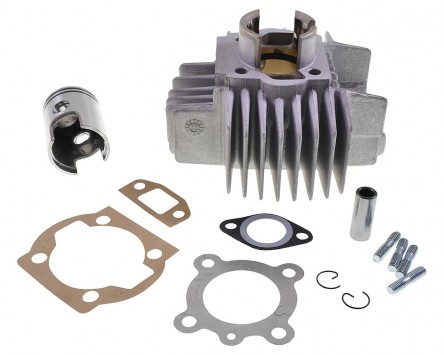 Zylinderkit 49ccm Sport aus dem Hause AIRSAL, passend für Puch Maxi Mofa. Der spanische Markenanbieter setzt bei diesen Zylindern auf Aluminium mit einer hartverchromter Laufbahn, welche gegenüber Grauguss eine deutlich bessere Wärmeableitung aufweist. Dadurch ist der Zylinder weniger anfällig für Verschleiß und Kolbenklemmer durch Temperaturprobleme. Leistungsmäßig ist der Alu-Sport mit seinem einteiligen Auslass und zwei Kolbenringen etwas über dem originalen Zylinder anzusiedeln. Der Zylinder ist deutlich verschleißärmer und alltagstauglicher als andere in seiner Klasse und glänzt mit einer ordentlichen Beschleunigung. Der Vergaser sollte passend abgestimmt werden, ein größerer Vergaser ist nicht zwingend nötig aber empfohlen, da dadurch eine bessere Kühlung gewährleistet ist.